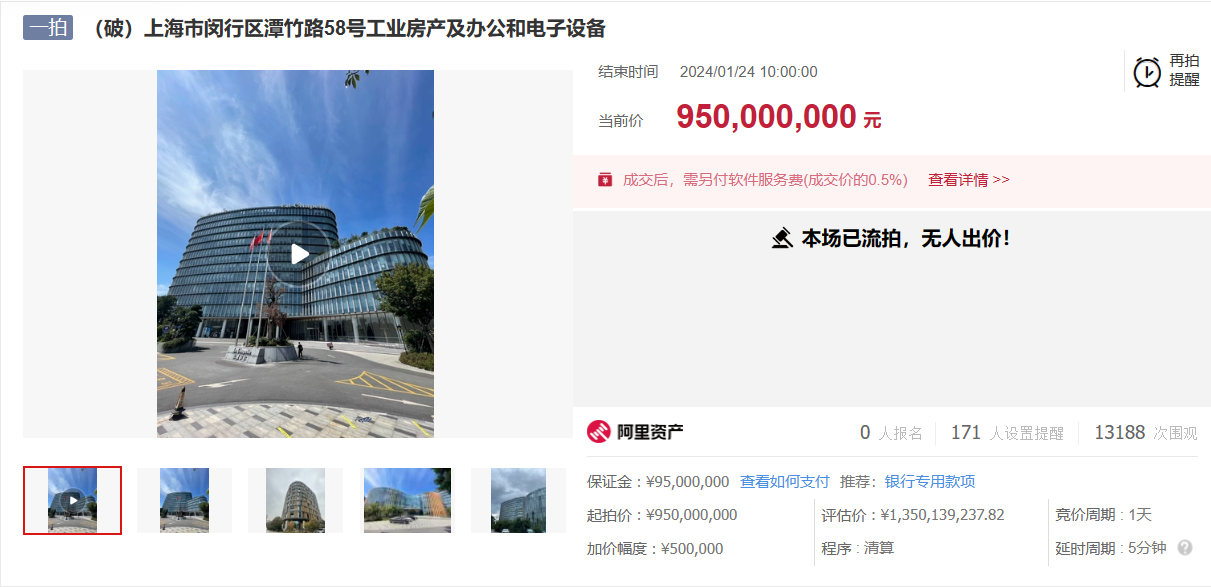 1月24日,据阿里资产拍卖网披露的信息,上海市闵行区潭竹路58号工业房产及办公和电子设备因无人报名出价而流拍,当前的起拍价为9.5亿元,评估价约13.5亿元。