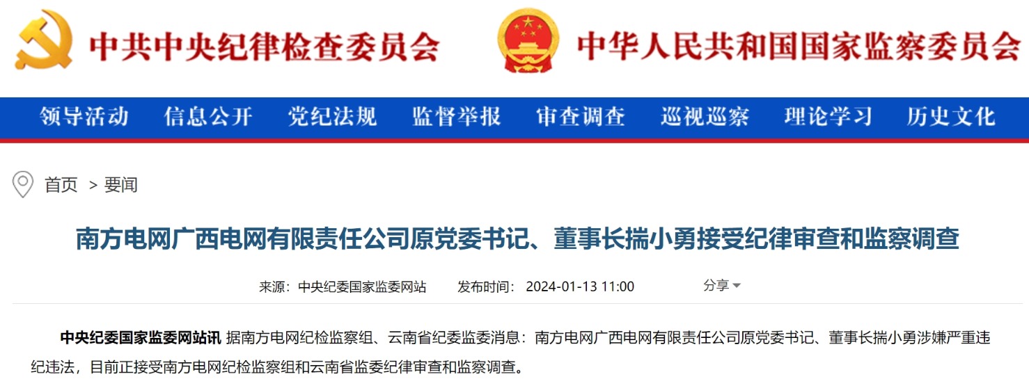 1月13日,中央纪委国家监委网站通报,南方电网广西电网有限责任公司原党委书记、董事长揣小勇接受纪律审查和监察调查。